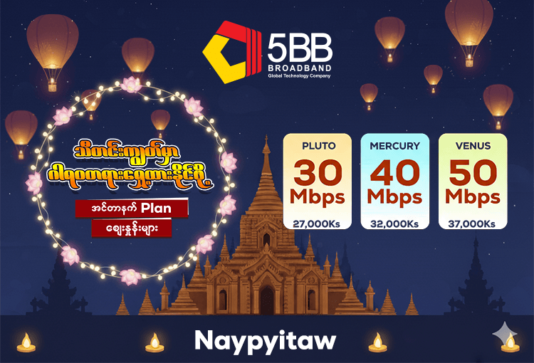 ပို၍ပို၍ ကောင်းမွန်သော အင်တာနက် ဝန်ဆောင်မှုများကို ပေးစွမ်းနိုင်ရန် ၂၀၂၅ ခုနှစ် အောက်တိုဘာလ (၁) ရက်နေ့မှ စတင်ပြီး နေပြည်တော်မြို့ရှိ 5BB Broadband Prepaid Plan များအား လစဉ်ကြေးနှုန်းထား အသစ်များဖြင့် ကောက်ခံသွားမည်ဖြစ်ကြောင်း အသိပေး အကြောင်းကြား မေတ္တာရပ်ခံအပ်ပါသည်။
